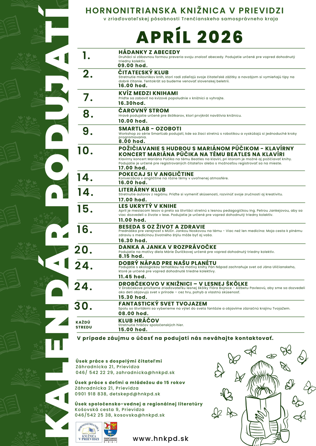 - 2. apríla 2026 o 16.00 hod. sa stretnú milovníci kníh na Čitateľskom klube, ktorý bude tentokrát venovaný slovenskej beletrii,