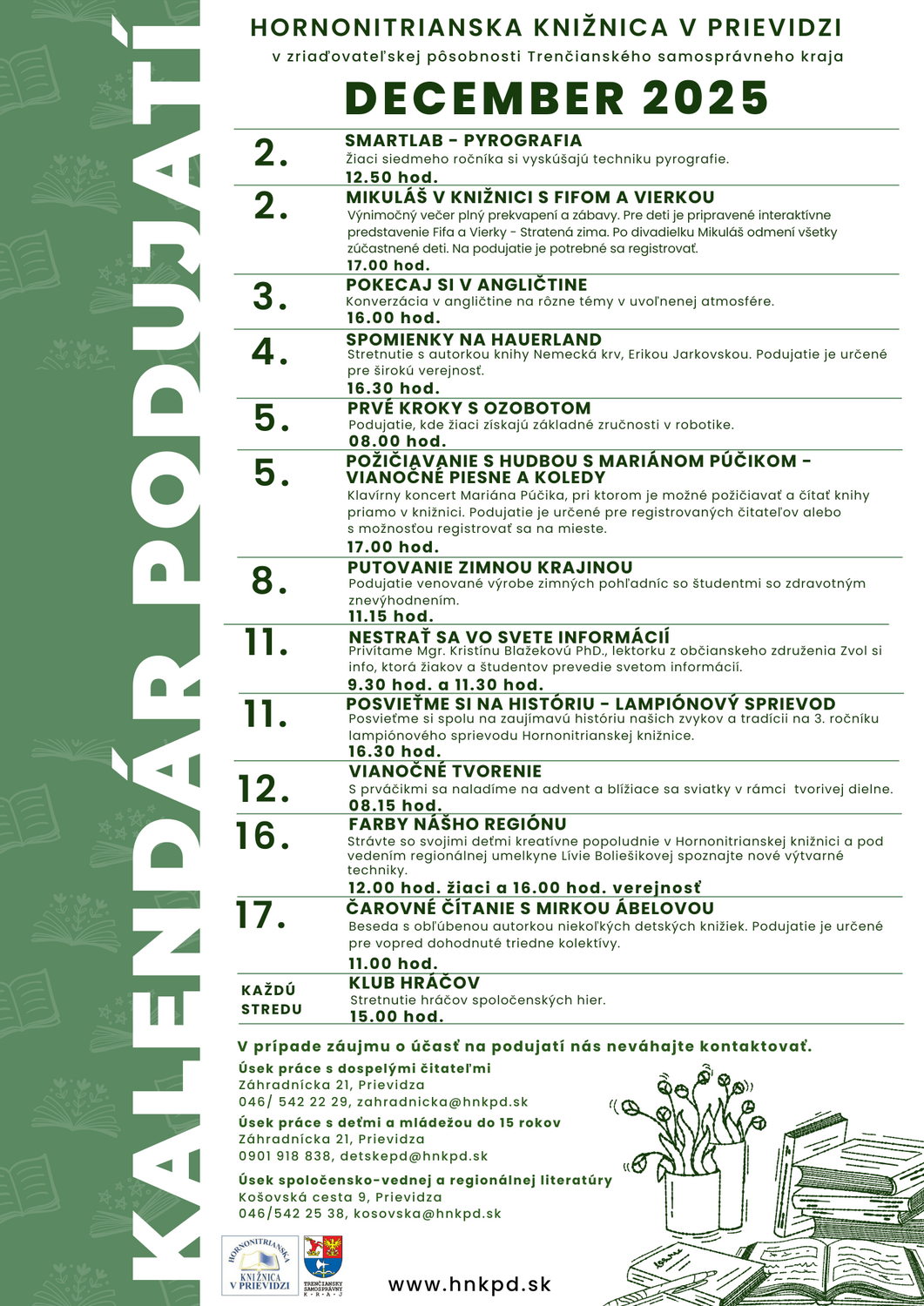 Už 2. decembra o 17.00 hod. sa deti môžu tešiť na Mikuláša v knižnici s Fifom a Vierkou. Na Vianoce sa naladíme už 5. decembra o 17.00 hod. - na našich čitateľov čaká prvý zo série klavírnych koncertov Požičiavanie s hudbou s Mariánom Púčikom. Návštevníci knižnice si tak budú môcť požičiavať a čítať knižky pri príjemných vianočných melódiách.