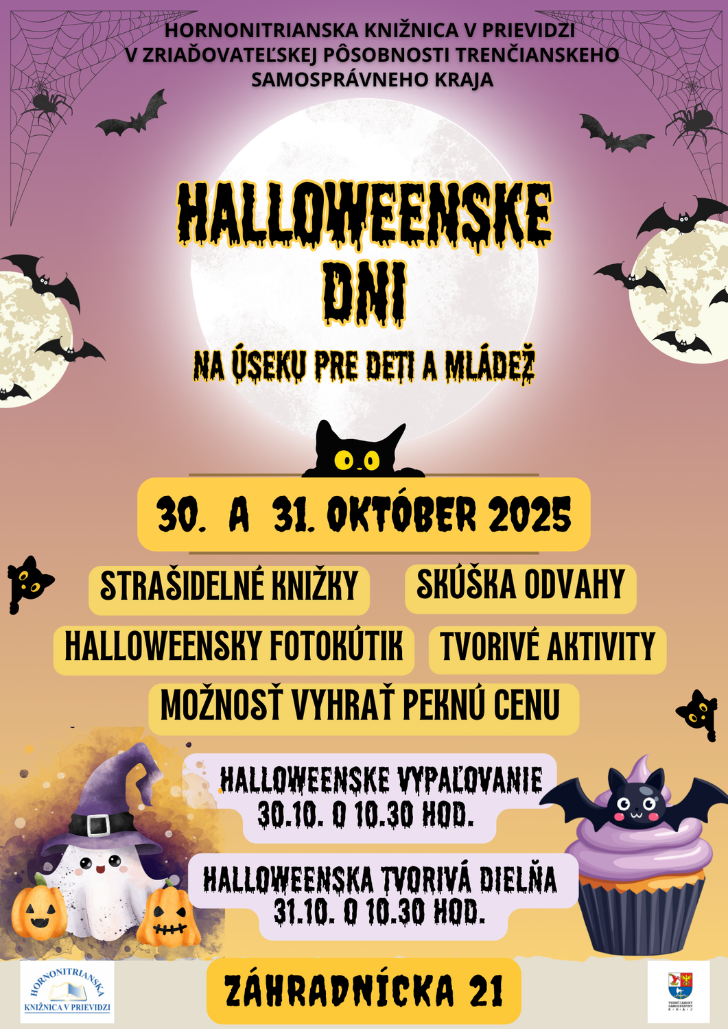 Na návštevníkov bude počas oboch dní čakať výber strašidelných kníh pre malých aj veľkých odvážlivcov, halloweensky fotokútik, tvorivé aktivity a pre tých najodvážnejších skúška odvahy. Každý kto si v tento deň príde požičať knižky a zapojí sa do niektorej z aktivít, bude automaticky zaradený do žrebovania a bude mať šancu vyhrať peknú cenu.