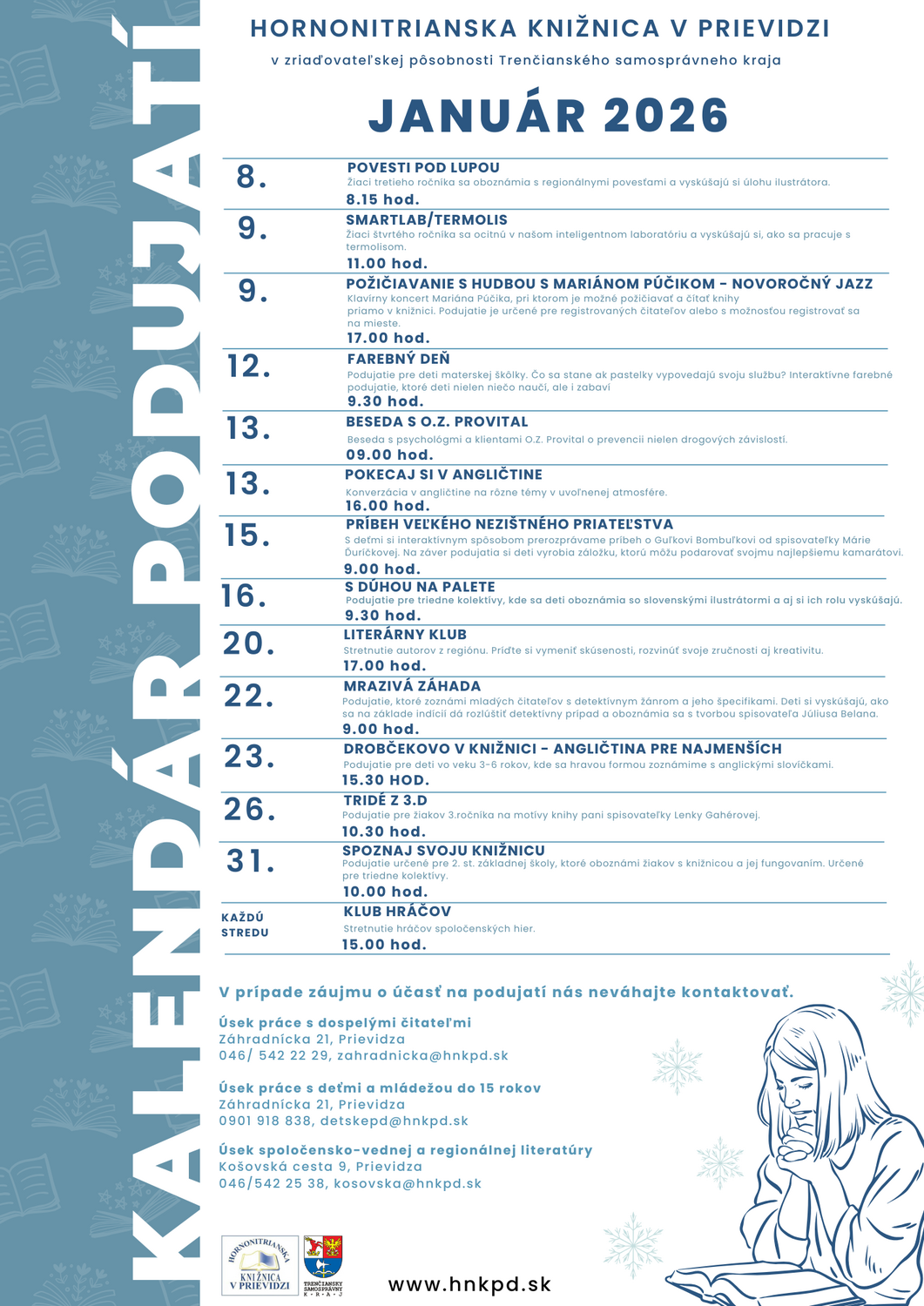 Dňa 13. januára o 16.00 hod. sa uskutoční konverzácia v angličtine Pokecaj si v angličtine a 20. januára o 17.00 hod. sa stretnú nadšenci kreatívneho písania a literárne činní autori v Literárnom klube.