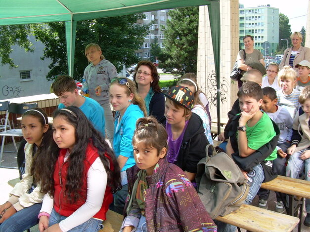 Nehodovalo sa len na hlavnom pódiu pred knižnicou. Pestrú paletu programu obohatili tvorivé dielne - maľovanie ilustrácií podľa prečítaného úryvku z rozprávkovej knihy, ďalšie deti maľovali podľa svojej fantázie. Všetky obrázky sme potom vystavili na špagáte na budove knižnice a na smreku, ktorý rastie pri knižnici. Okrem toho si deti vyrábali s pani Čičmancovou krásne bábky, zároveň sme jej bábky vystavovali na terase.