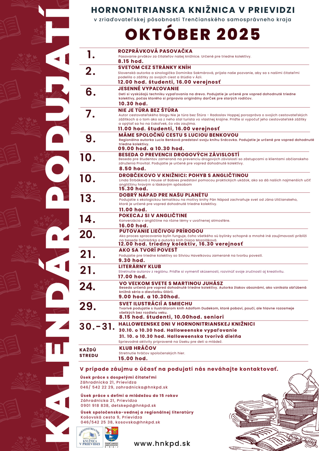 Prinášame kalendár podujatí, ktoré na vás čakajú v Hornonitrianskej knižnici v mesiaci október.