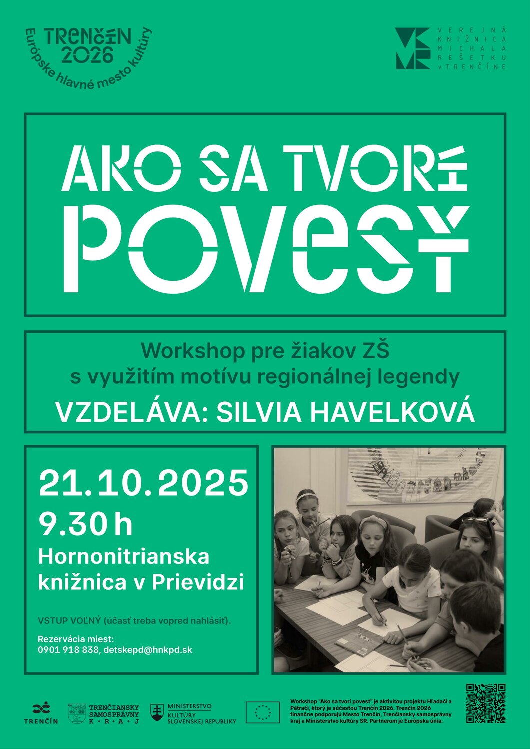 Workshop „Ako sa tvorí povesť“ je aktivitou projektu Hľadači a pátrači, ktorý je súčasťou iniciatívy Trenčín 2026 – Európske hlavné mesto kultúry. Projekt je finančne podporený Mestom Trenčín, Trenčianskym samosprávnym krajom a Ministerstvom kultúry SR. Spolufinancovaný je Európskou úniou.