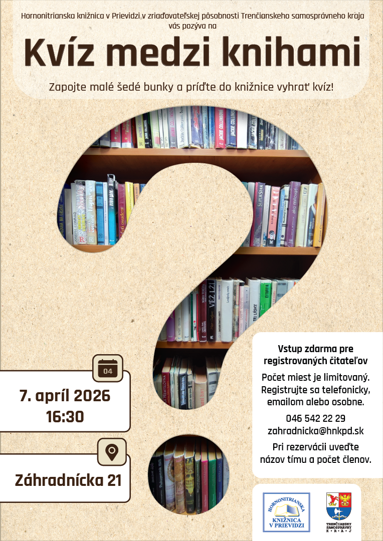 srdečne vás pozývame na kvízový podvečer, ktorý sa uskutoční 7.4.2026 o 16.30 hod. v priestoroch Hornonitrianskej knižnice v Prievidzi, Záhradnícka 21. Príďte si otestovať svoje vedomosti, zabaviť sa a stráviť príjemný čas v dobrej spoločnosti.