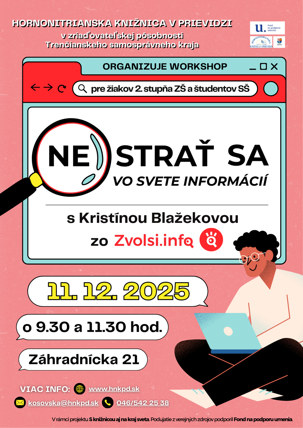 Pochopiť informácie, naučiť sa ich a kriticky zhodnotiť je čoraz dôležitejšie. Preto sme oslovili lektorov z občianskeho združenia Zvol si info, aby v našej knižnici zrealizovali workshopy pre žiakov a študentov. Tešíme sa, že našu knižnicu navštívi Mgr. Kristína Blažeková PhD., aby naučila žiakov a študentov, ako kriticky rozmýšľať a orientovať sa v mediálnom svete.