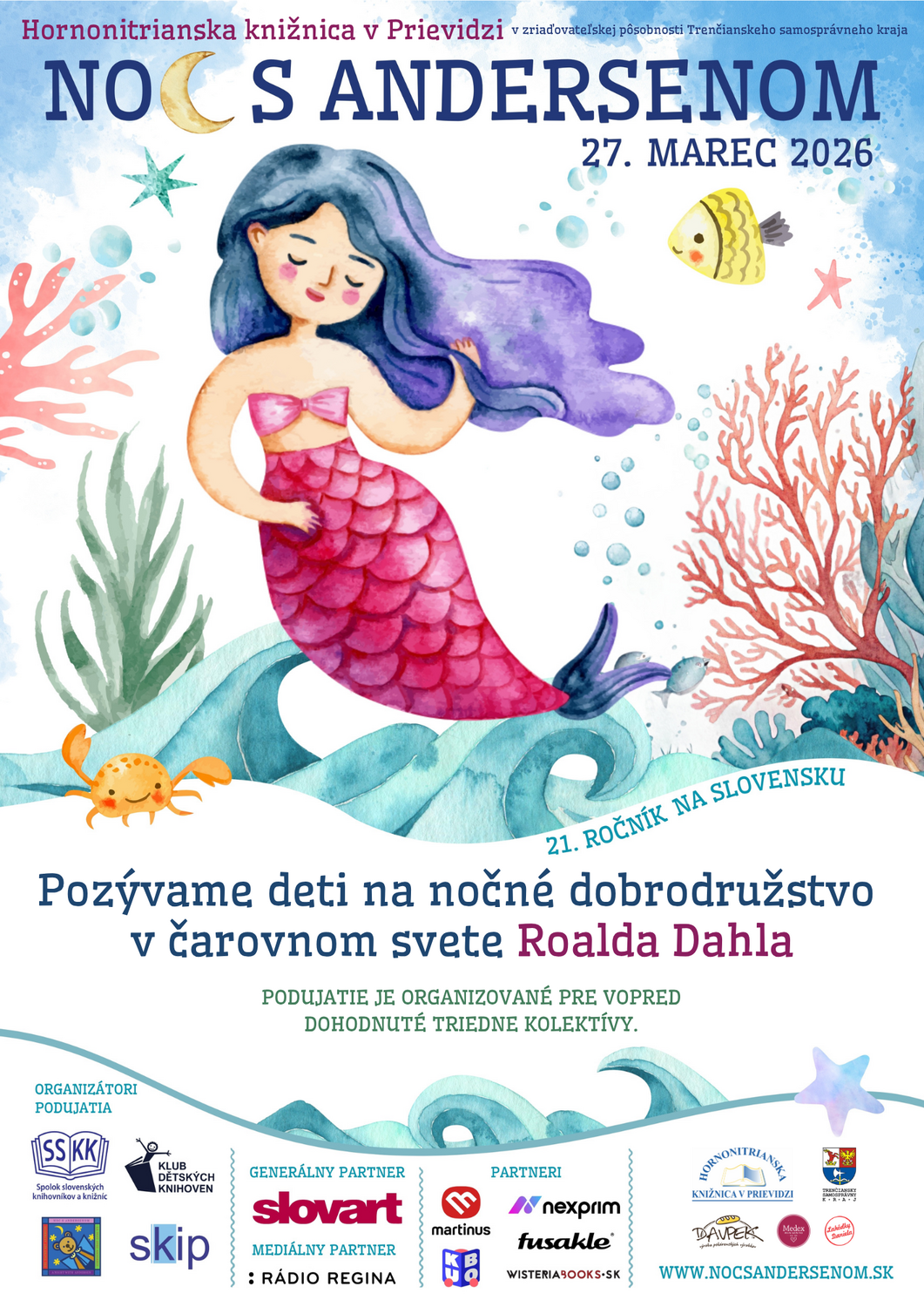 S radosťou vás informujeme, že 27. marca 2026 sa uskutoční obľúbené podujatie Noc s Andersenom, tentoraz na tému inšpirovanú knihami Roalda Dahla. Toto jedinečné podujatie je určené pre vopred dohodnuté triedne kolektívy, ktoré sa môžu tešiť na nezabudnuteľnú noc plnú aktivít, rozprávok a fantázie.