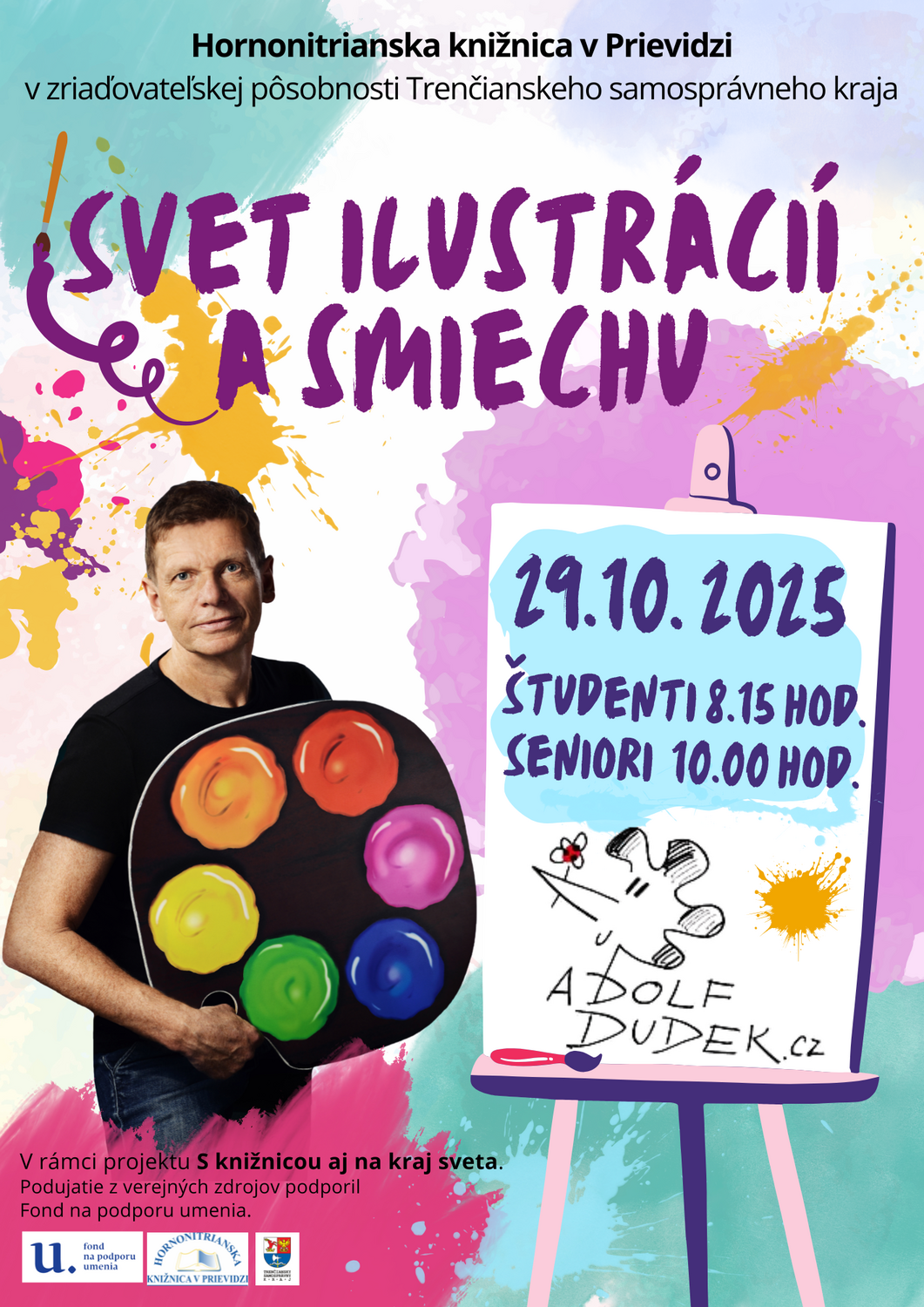 Dňa 29. októbra 2025 sa priestory Hornonitrianskej knižnice v Prievidzi na Záhradníckej ulici 21 rozozvučia smiechom a kreativitou. Navštívi nás totiž Adolf Dudek – známy český ilustrátor detských kníh a obľúbený zabávač, ktorého meno je spojené s originálnym, interaktívnym prístupom k svetu ilustrácií.