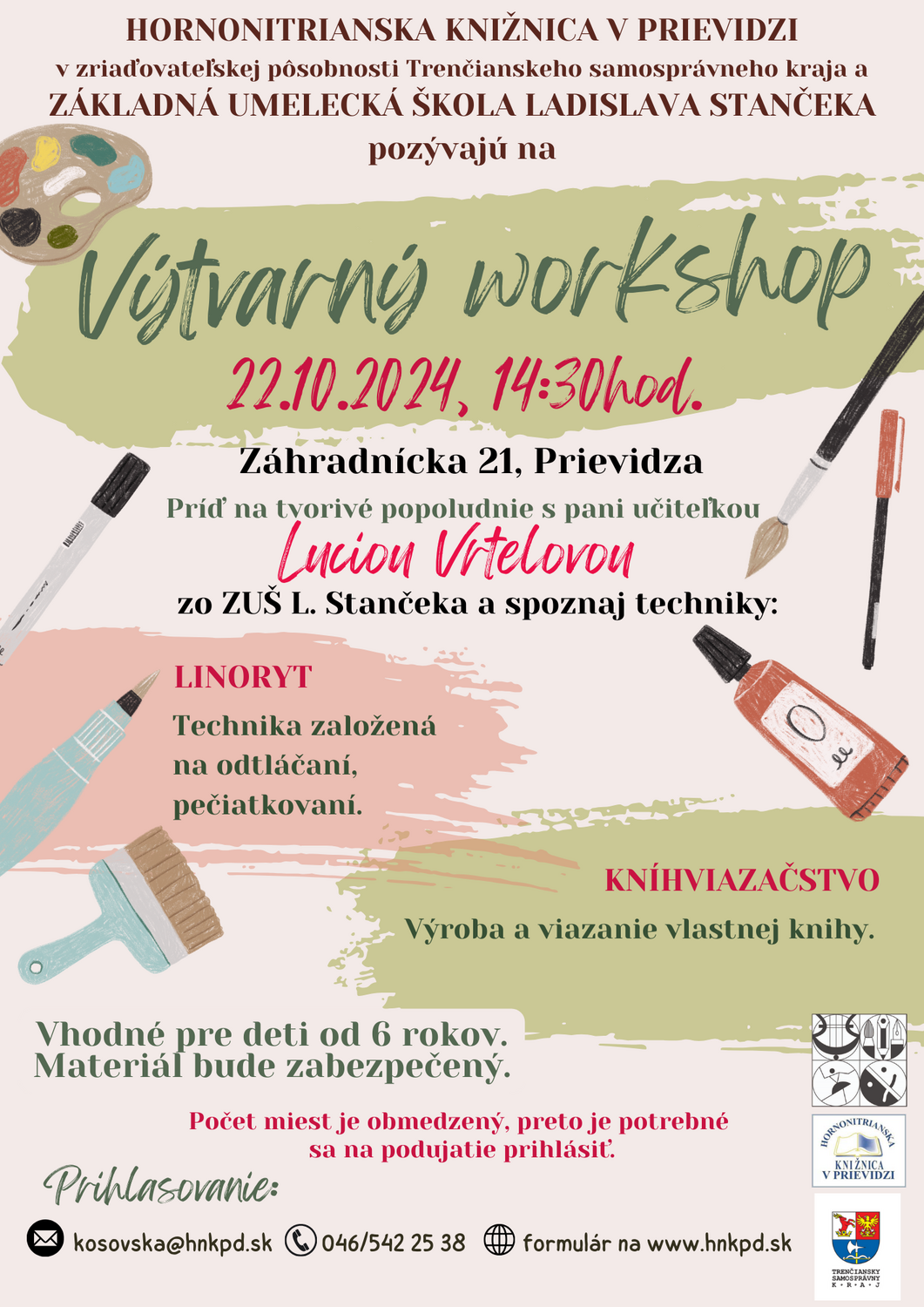 Priestor knižnice na Záhradníckej ulici č. 21 v Prievidzi sa zmení na umelecký ateliér, kde spolu objavíme tajomstvo kníhviazačstva a techniky linoryt – odtláčania. Podujatie je určené pre deti od 6 rokov.
